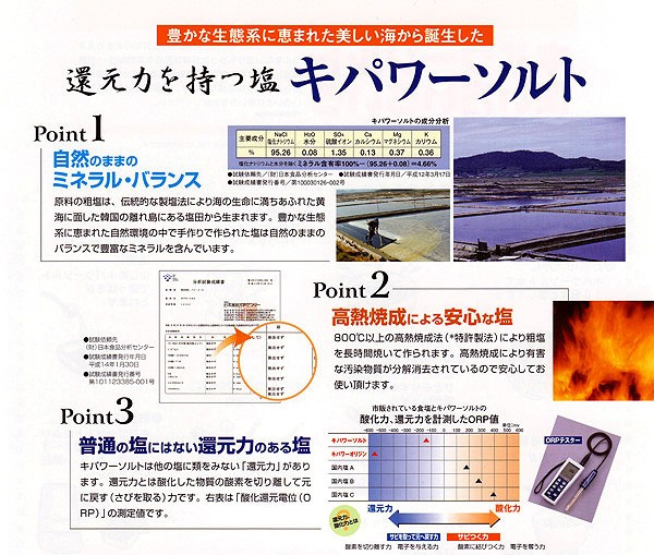 ![]() キパワーソルトについて キパワーソルトは、韓国の塩田で、伝統的な製法で作られたお塩です。 一切の添加物は用いず、塩田の海水の中で、自然の力だけで結晶した塩には、 私達が必要とする、ミネラルが含まれています。 この塩田の塩を特許製法による、800℃以上の高温で焼成して作られています。 キパワーソルトは、お料理で、食材の旨みを引出す調味料としてもちろんですが、 様々な使い方で、親しまれています。 焼き塩なので、粒子は、サラサラの白い粉末状です。 少しなめてみると、塩辛いだけじゃなくて、旨みがあるんですよ!