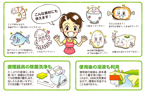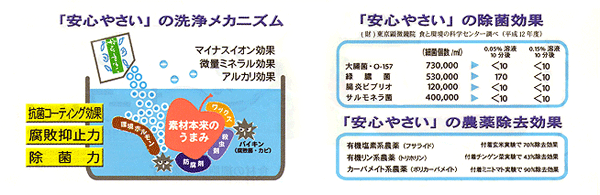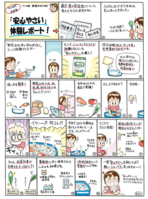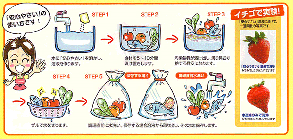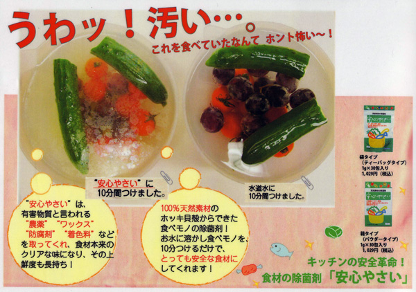 ![]() ![]() ![]() ~『安心やさい』とは?~ 「安心やさい」は、100パーセント天然の素材で出来ているから、 安心して、食材を洗えます! 天然の素材で出来ているもう一つの良いところは、 排水をキッチンから流しても、また、自然に帰るのところです☆ 嬉しいですよね! そして、使い終わった「安心やさい」を流すことで、キッチンの排水のパイプも キレイにお掃除してくれます♪ 「安心やさい」を使ってみると、ビックリするくらい、 お野菜の汚れが浮いてくるんですよ。 そして、そのまま、軽く水気を切って、 ビニールの袋に、お野菜を入れて保存すると、 保存もききます! 長持ちするんです。 いつものお野菜を「安心やさい」で、洗って、 お野菜の本当の美味しさを楽しんでみませんか? 「安心やさい」は、お野菜だけじゃなくて、 お魚や、お肉、お豆腐などの食材も洗えます! お寿司屋さんなど、素材が勝負のプロの料理人も、 「安心やさい」を使っているんですよ。 ~お客様の声~ 『安心やさい』を使用してみてびっくり☆ 安心やさいを初めて使ったとき、農薬や有害物質が水に浮いてきた量の多さに、本当に驚きま した。「こんなもの今まで口にしていたのか!?」とゾッとしてし まいました。洗ったあとの食材のおいしさには感動しています。また何より、安心して子どもたちに食事を作ってあげられることが嬉しいです。 (神奈川県 K・K様 ) サラダに使う野菜は『安心やさい』で 食の安全を考えると、特にサラダに使うお野菜などは「安心やさい」に漬けないで食べる気がしなくなりました。きのこ類などもプリプリして味が良くなります。めんどくさいとは思いながらも、やっぱり持ちが違うし味も良くなるので、我が家の必需品です。 (東京都 M・H様 ) 食材が長持ちして経済的 一人暮らしをしているので、野菜を買ってきても食べきれず腐ってしまうことが、多々ありま した。『安心やさい』を使うと長持ちすると聞いて早速購入しまし た。使いはじめてからというもの、食材がいつまでも元気なので食べ物を無駄にすることなく、経済的にも有難く使わせいただいてます。 (兵庫県 Y・Y様) 野菜や果物が長持ち! 『安心やさい』で洗うと、野菜や果物が長持ちします。味がおいしくなりますし、本来の甘みなどが戻る気がします。また『安心やさい』をお風呂に入れると、汗が出て大変血行がよくなります。 (東京都 Y・H様) ~使用方法です~