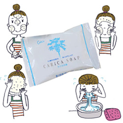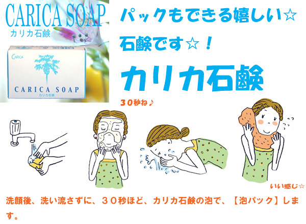 カリカ石けんのお話です おばあちゃんと、 石けんの話をしていたんですよ。 今使っている、チューブタイプのものの、 良いところ、ちょっと困っているところなどです。 使いやすくて、泡がフワッと沢山取れるといいそうだったので、 手元にあったサンプルですけれど、 あの、カリカ石けん、 「使いかけだけど使ってみますか?」 んで、朝になって、 おばあちゃんは、すごい笑顔でね☆ 「すごい、ツルツルで、良い石けんだねえ~」 「一回洗って、嬉しかったから、もう一回泡立てて、使ってたよ~☆」 聞いてて、ちょっと、涙ぐんでしまいました。 やっぱり、『カリカ石けん』って良いし、 1人でも、この使用感をお届けできたら、 感動もお届けできる!! 少し、石けん、我慢して使っているかも… そんな時、ぜひ、カリカ石けんを使ってみてください!! 日本に、笑顔がど~んと咲きますよ♪ 男だけど、洗顔石けんにはこだわってますよ~ 店主 山田伸一 ![]() お客様の声 吹き出物にはクリーミーな泡パック 吹出物が出来た時に、『カリカ石鹸』をよく泡立てて、そのクリーミーな泡を肌の上にパックのようにしばらくのせておくと、直りがとても早いようです。 (東京都 D・S様 20代 男性) 経皮毒の心配がいらない石鹸 私は経皮毒が怖いので、安全な石鹸をと思い『カリカ石鹸』を使用しています。さっぱりするし、お肌に優しいから気に入っています。 (東京都 Y・H様 20代 男性) 入浴後の体のかゆみがない 他の石鹸を使用していた頃は、皮膚が乾燥するせいか、かゆかったりしたのですが、『カリカ石鹸』は入浴後の体のかゆみなどが起こらないようです。 (東京都 男性 30代) 使い方のポイント! もちろん、普通の使い方でも、カリカ石けんの魅力は感じていただけます。 けれど、せっかく、カリカが配合されているので、楽しんでみましょう☆ 泡は、泡立てネットを使用して、 空気をたっぷりと含ませて、泡を沢山作ってくださいね。 たっぷりの泡は、お肌を優しく包み込みます。 カリカ石けんの泡は、しっかりとした、コシのある感じです。 たっぷりの泡を作るのは、少々、手間がかかりますけれど、 石けんを上手に使うことになるので、経済的にも良いと思います。んで、その泡を、お顔に乗せて、 しばらく泡パックします。 3~5分が程よい感じですけれど、好みで加減してください。 ![]() 『カリカ石鹸』をおすすめする理由 【1】カリカセラピ』をたっぷり配合! 酸化を防ぐ力に優れた「カリカセラピ」をたっぷり配合だから、明るく透明感のある肌に。 【2】洗いあがりはしっとり、モチ肌に! 肌の脂汚れをスッキリ落とすのに、洗いあがりはしっとり! 【3】敏感肌にもおすすめ 化学物質無添加だから低刺激ですから、普通の石鹸では皮膚がつっぱったり、ヒリヒリしやすい方、肌の弱い方にもおすすめです。 【4】泡立ちがとってもクリーミー! 無添加なのに泡立ちに弾力があって、とってもクリーミー! 弾力のある泡のクリームで肌をやさしく包みこむように洗います。 【5】これ1個で髪の毛からつま先まで! カリカ石鹸1個で、髪の毛から、つま先まで全身が洗えるので経済的です。 豆知識 ~カリカセラピについて~ パパイアは昔から、『メディカルフルーツ』『天使の果物』と呼ばれ大事にされてきました。 そのパパイアを日本の発酵技術で丁寧に仕上げたのが、カリカセラピPS-501です。 甘くて美味しいので続けやすく、お子様にも喜ばれます。 ![]() カリカセラピ PS-501