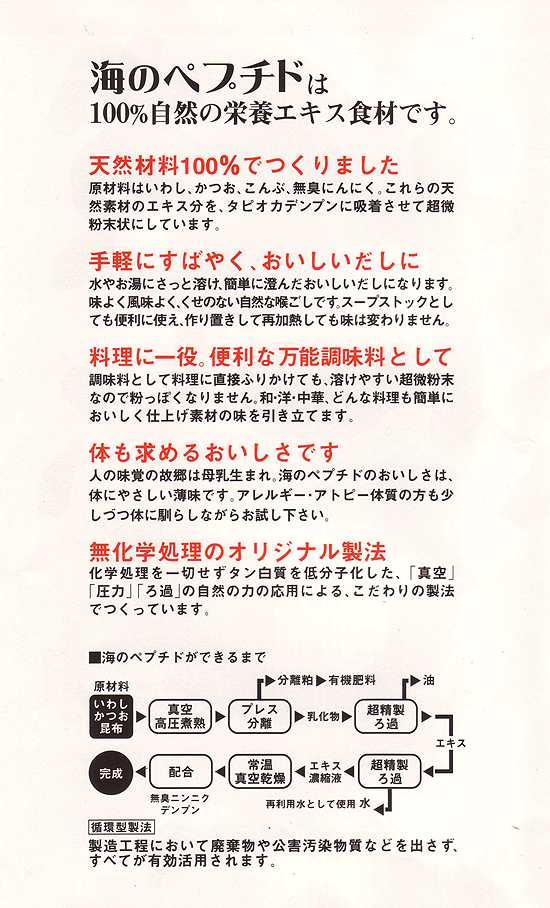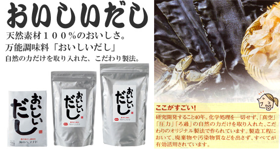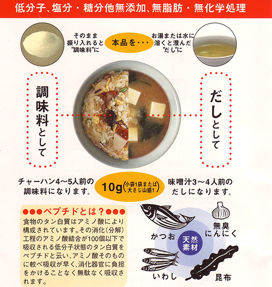 ■天然素材100%の上品なおいしいだし■ 天然素材100%の上品な味。自然の力だけを使い、 こだわりの製法で仕上げた万能調味料「おいしいだし」 ![]() ![]() サラサラの超微粒子で使いやすくなってます。 そのままなめてみても、おいしかったです! お昼に、『おいしいだし』でお味噌汁を作ってます。 まるで、インスタントみたいな手順で作れるけれど、飲んでみると、かなり美味いのでビックリしますよ! お味噌の量の加減をしっかりすればうまくいきます。 こんなに手軽で、美味しくて栄養たっぷりってありがたいですよ。 「午後からもがんばるぞ!」 って、お味噌汁で充電している感じです(笑) 『おいしいだし』は、サッと解けるので使いやすいです。 手軽に、ご飯に、『おいしいだし』と、とろろ昆布・梅干、お塩を少々でお茶漬けも美味いです☆ 煮物・炊き込みご飯・チャーハンなど、和・洋・中、ジャンルを選ばず使える、お料理の味方だと思います。 おススメのおいしいだしですよ。 店主 山田伸一![]() おすすめの使い方 「おいしいだし」10gに180~200ccのお湯を注いで召し上がってみてください。なんともいえない懐かしいような風味。あっさりとしているけれども、舌の奥では深みのある味わいを感じることができます。栄養スープとしてもおすすめします! 天然素材100% 塩分・糖分無添加 無脂肪 無科学処理 ペプチドだしは、おいしくて安心、便利な万能だし調味料です。 100%天然素材、塩は調合していません。 そして、砂糖・保存料・添加物などは一切使用しておりません。 酸化しやすい脂肪は含まれていません。 「どこかで逢った、懐かしい味…」 天然素材100%だから、上品でまろやかな味。 こだわりの製法で仕上げました。 かつお・いわし・昆布・無臭にんにくを使用。